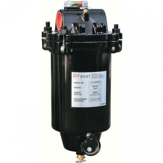 The Facet VF-21SB/22SB, when configured as a filter water separator, is an economical, compact housing designed to remove water and solids from aviation fuels. Both interior and exterior surfaces of the carbon steel body are epoxy coated to protect against corrosion. This sturdy, single cartridge housing is easy to maintain and requires only 2″ (51 mm) base clearance for cartridge change out.